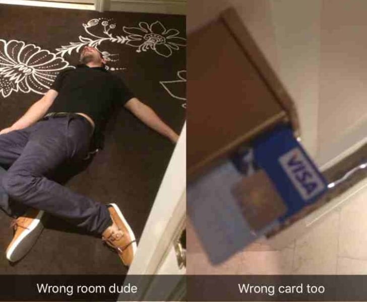 Obviously, this fellow tried making his way back to the room when everything was said and done. However, he didn’t quite manage. Not only did he not find the accommodation, but he tried using his credit card as a room key! Shortly after that, gravity took hold and placed this person solidly on the floor.